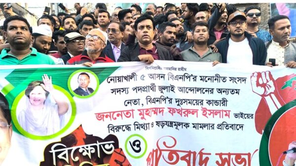 কোম্পানীগঞ্জে নোয়াখালী-৫ আসনের বিএনপির এমপি প্রার্থী ফখরুল ইসলামের বিরুদ্ধে মিথ্যা মামলার প্রতিবাদে বিক্ষোভ মিছিল ও প্রতিবাদ সভা